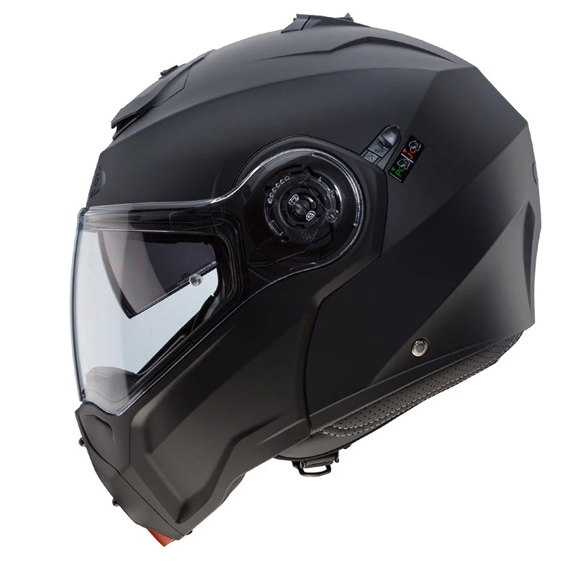 Droid è il nuovo apribile di casa caberg 100% made in italy dotato di soluzioni tecniche innovative, design estremamente aggressivo e spiccata personalità per i motociclisti che non vogliono passare inosservati. La mentoniera frontale presenta due grandi prese d’aria regolabili individualmente che convogliano l’aria sulla visiera, evitando l’appannamento nelle condizioni climatiche più estreme. L’aerazione interna è garantita inoltre da una grande presa d’aria frontale regolabile e dai canali presenti nella calotta interna del casco. Frutto dell’esperienza maturata dalla prima azienda italiana ad aver prodotto caschi apribili, Il nuovo DROID è dotato della doppia omologazione P/J che permette di guidare anche a mentoniera alzata sempre in sicurezza grazie al selettore posizionato sulla sinistra del casco che, nella posizione J, blocca la mentoniera nella posizione di massima apertura evitando così la chiusura accidentale della stessa. Grazie alle ridotte dimensioni del casco, il peso del nuovo DROID è di solo 1550 +-50 gr.