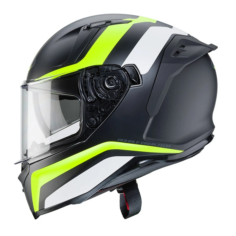 Avalon è l’integrale di casa caberg dal design di ispirazione sportiva pensato per i più giovani ma non solo, considerando le ricche dotazioni di cui è dotato. La calotta è realizzata in due misure per garantire il massimo comfort e l’equilibrio perfetto tra le dimensioni del casco e la taglia del motociclista a tutto vantaggio del comfort di viaggio. AVALON è un casco adatto ai brevi spostamenti urbani ma anche ai più impegnativi percorsi extra urbani. AVALON è dotato di visiera antigraffio predisposta per l’inserimento della lente anti appannamento e del visierino parasole DVT (Double Visor Tech) facile da azionare anche con i guanti attraverso la leva posta sul lato sinistro. Entrambe le visiere sono facilmente removibili senza l’utilizzo di attrezzi per la pulizia o per la sostituzione. Le abbondanti prese d’aria regolabili presenti nella zona superiore ed inferiore del casco permettono un ottimo ingresso di aria fresca e grazie agli estrattori di aria posti sotto lo spoiler posteriore è garantito un ottimo ricircolo d’aria. L’interno, removibile e lavabile, è realizzato con tessuti e reti traspiranti. Il cinturino è dotato di fibbia micrometrica per una facile regolazione. AVALON è dotato di sottogola e nasetto entrambi removibili. AVALON può essere equipaggiato con il comunicatore Caberg JUST SPEAK EVO o con altro comunicatore in commercio grazie alle sedi presenti all’interno per alloggiare gli altoparlanti. Oltre alle versioni monocolore Nero opaco e Bianco, AVALON è offerto in tre versioni grafiche e numerose varianti colore: HAWK e GIGA sono le due versioni grafiche più accattivanti e sportive mentre la versione BLAST è più classica ed elegante. Calotta: LG CHEM HI-IMPACT ABS. Doppia taglia calotta. Doppia visiera (trasparente e fumé). Sganciamento rapido visiera. Visiera antigraffio pronta per FogCity GO. Fibbia micrometrica. Aerazione interna. Interno estraibile e lavabile. Profili antipioggia. Stop-wind amovibile. Paranaso estraibile. Predisposto per alloggiamento Just Speak EVO o altri interfoni in after market.
