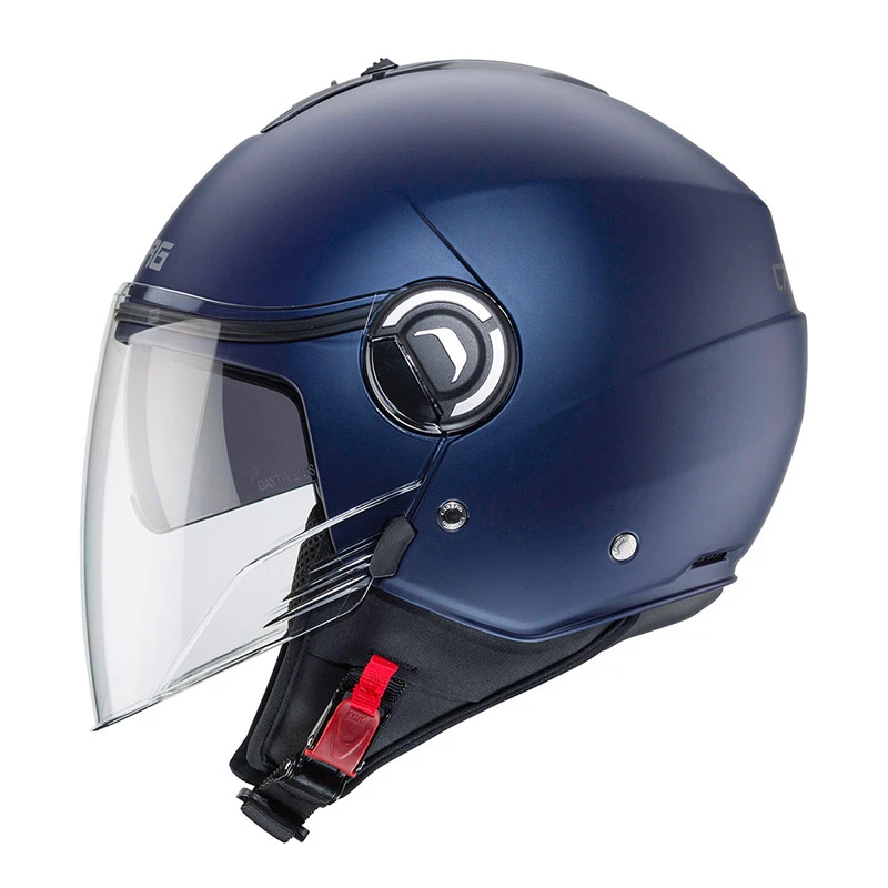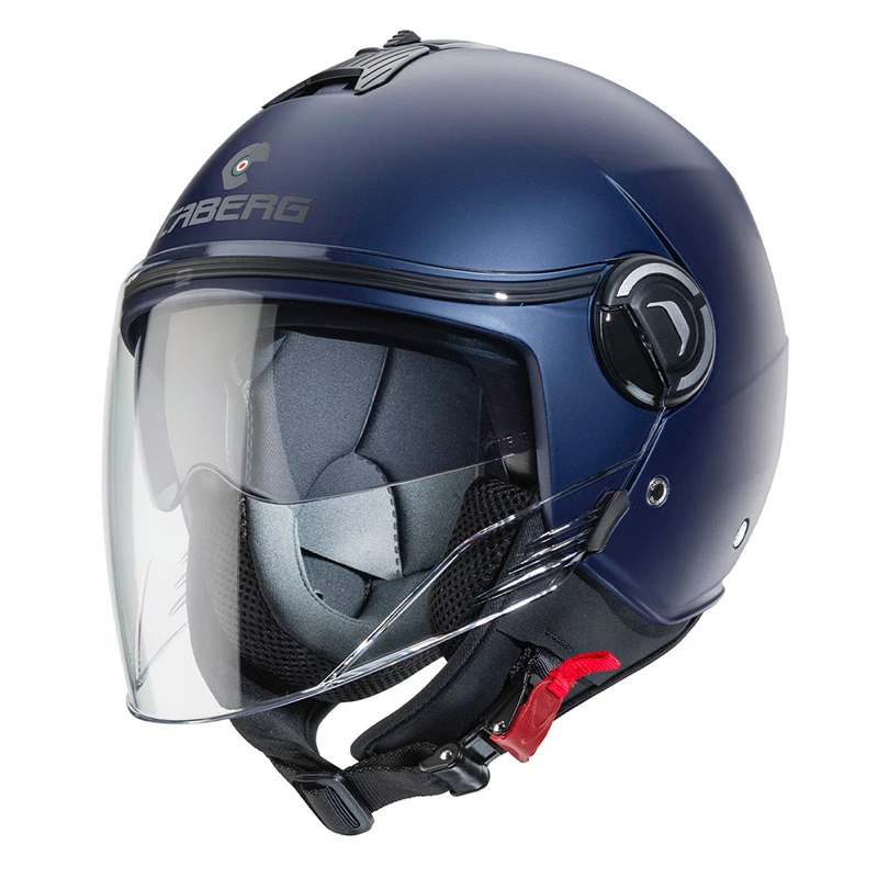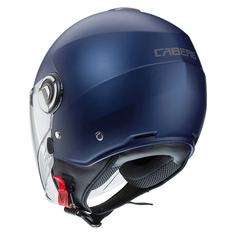Riviera v4 è il nuovo demi jet di caberg dalle linee innovative ed eleganti pensato sia per l’utilizzo urbano ma anche extra urbano. È prodotto in due taglie di calotta per permettere una perfetta proporzione tra il volume del casco e la taglia del motociclista. Inoltre, grazie al ridotto volume, il casco risulta essere pratico e comodo con la possibilità di essere stivato facilmente nei sottosella più stretti. Il sistema di ventilazione è costituito da una presa d’aria superiore e da due estrattori posteriori, offrendo un confort ottimale anche nelle condizioni atmosferiche più estreme. L’esclusivo sistema double visor tech di caberg permette di guidare sempre con la luce ideale e quindi in piena sicurezza, grazie ad una visiera parasole interna facilmente manovrabile. Inoltre, riviera v4, rispetto al modello precedente, ha una visiera esterna e una visiera parasole più lunghe così da permettere una maggiore protezione e confort durante la guida. La fibbia a regolazione micrometrica permette una sicura ma facile regolazione. Inoltre è presente un anello d’acciaio per assicurare il casco alla motocicletta. Gli interni, compreso il paranuca, sono completamente estraibili e lavabili e sono studiati con tessuti ad alta traspirabilità. Riviera v4 è predisposto per accogliere il sistema di comunicazione wireless caberg just speak evo che, grazie alla tecnologia bluetooth, permette di comunicare non solo con il proprio telefono cellulare e con il proprio passeggero, ma anche di collegarsi ad un navigatore satellitare ed ascoltare musica attraverso un lettore mp3 o attraverso il cellulare. Just speak evo utilizza il profilo bluetooth a2dp.