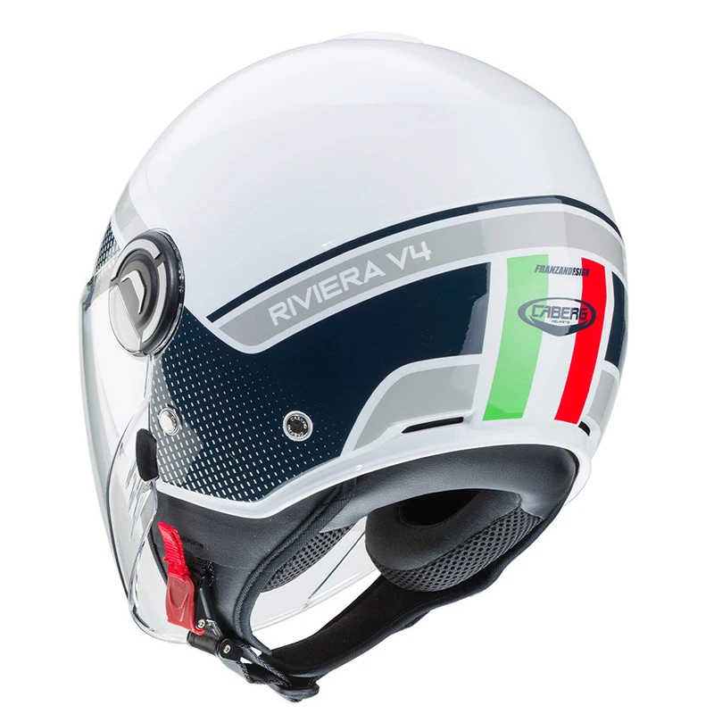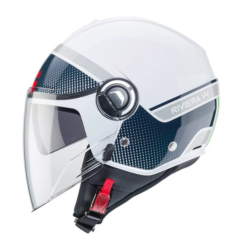 Riviera v4 è il nuovo demi jet di caberg dalle linee innovative ed eleganti pensato sia per l’utilizzo urbano ma anche extra urbano. È prodotto in due taglie di calotta per permettere una perfetta proporzione tra il volume del casco e la taglia del motociclista. Inoltre, grazie al ridotto volume, il casco risulta essere pratico e comodo con la possibilità di essere stivato facilmente nei sottosella più stretti. Il sistema di ventilazione è costituito da una presa d’aria superiore e da due estrattori posteriori, offrendo un confort ottimale anche nelle condizioni atmosferiche più estreme. L’esclusivo sistema double visor tech di caberg permette di guidare sempre con la luce ideale e quindi in piena sicurezza, grazie ad una visiera parasole interna facilmente manovrabile. Inoltre, riviera v4, rispetto al modello precedente, ha una visiera esterna e una visiera parasole più lunghe così da permettere una maggiore protezione e confort durante la guida. La fibbia a regolazione micrometrica permette una sicura ma facile regolazione. Inoltre è presente un anello d’acciaio per assicurare il casco alla motocicletta. Gli interni, compreso il paranuca, sono completamente estraibili e lavabili e sono studiati con tessuti ad alta traspirabilità. Riviera v4 è predisposto per accogliere il sistema di comunicazione wireless caberg just speak evo che, grazie alla tecnologia bluetooth, permette di comunicare non solo con il proprio telefono cellulare e con il proprio passeggero, ma anche di collegarsi ad un navigatore satellitare ed ascoltare musica attraverso un lettore mp3 o attraverso il cellulare. Just speak evo utilizza il profilo bluetooth a2dp.