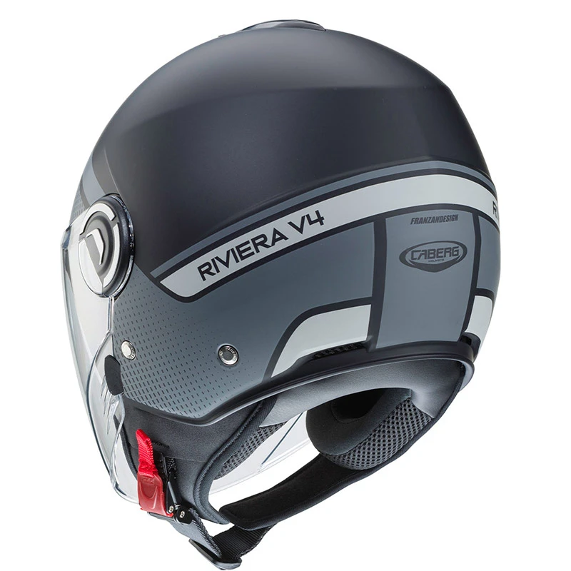 Riviera v4 è il nuovo demi jet di caberg dalle linee innovative ed eleganti pensato sia per l’utilizzo urbano ma anche extra urbano. È prodotto in due taglie di calotta per permettere una perfetta proporzione tra il volume del casco e la taglia del motociclista. Inoltre, grazie al ridotto volume, il casco risulta essere pratico e comodo con la possibilità di essere stivato facilmente nei sottosella più stretti. Il sistema di ventilazione è costituito da una presa d’aria superiore e da due estrattori posteriori, offrendo un confort ottimale anche nelle condizioni atmosferiche più estreme. L’esclusivo sistema double visor tech di caberg permette di guidare sempre con la luce ideale e quindi in piena sicurezza, grazie ad una visiera parasole interna facilmente manovrabile. Inoltre, riviera v4, rispetto al modello precedente, ha una visiera esterna e una visiera parasole più lunghe così da permettere una maggiore protezione e confort durante la guida. La fibbia a regolazione micrometrica permette una sicura ma facile regolazione. Inoltre è presente un anello d’acciaio per assicurare il casco alla motocicletta. Gli interni, compreso il paranuca, sono completamente estraibili e lavabili e sono studiati con tessuti ad alta traspirabilità. Riviera v4 è predisposto per accogliere il sistema di comunicazione wireless caberg just speak evo che, grazie alla tecnologia bluetooth, permette di comunicare non solo con il proprio telefono cellulare e con il proprio passeggero, ma anche di collegarsi ad un navigatore satellitare ed ascoltare musica attraverso un lettore mp3 o attraverso il cellulare. Just speak evo utilizza il profilo bluetooth a2dp.